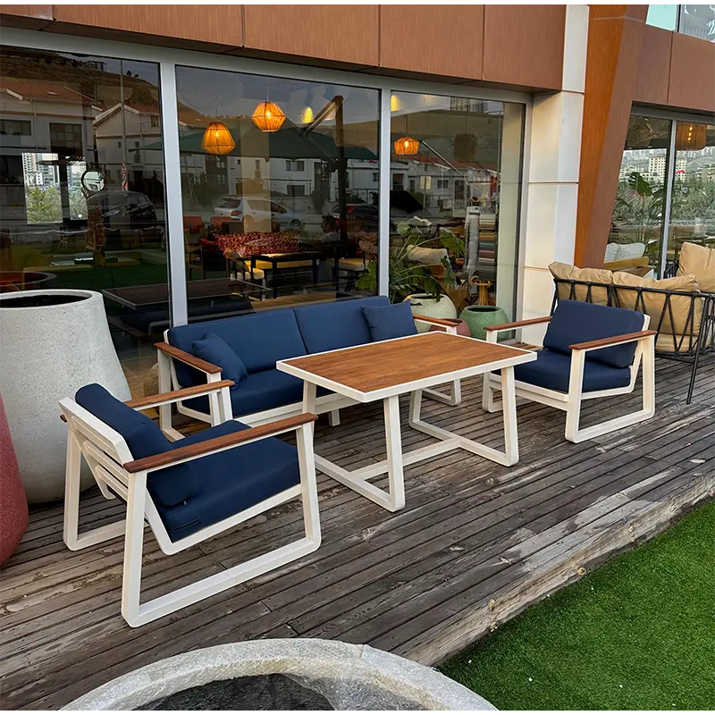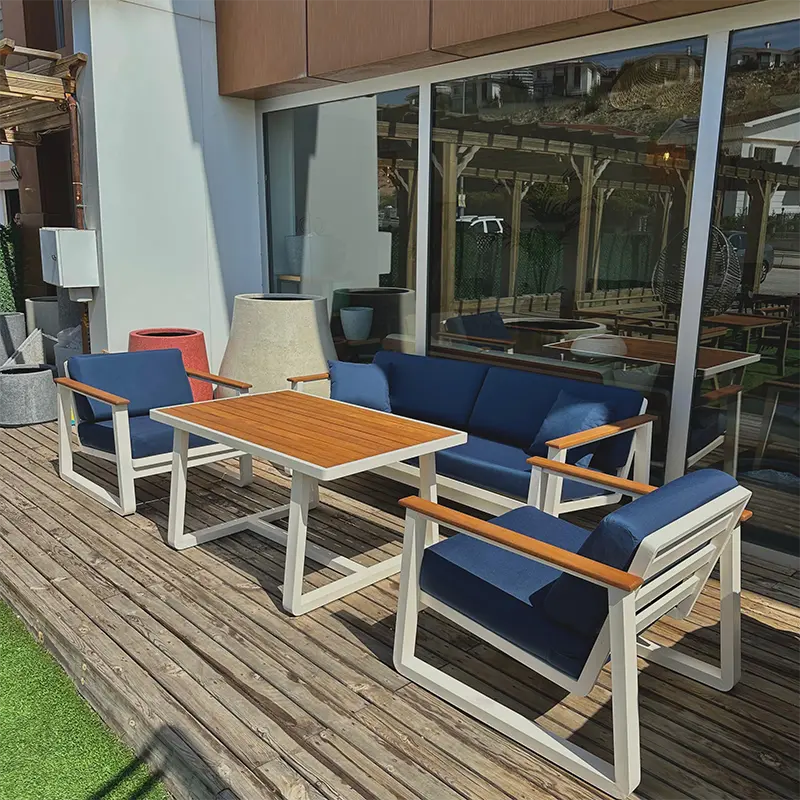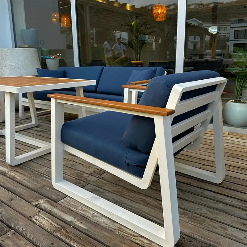 Hafif kolay taşınabilir, Alüminyum iskelet ve iroko ağacı, Yıkanabilir ve silinebilir kumaş, 6 adet sandalye 1 adet 180×90 masa, Oturum minderi dahildir